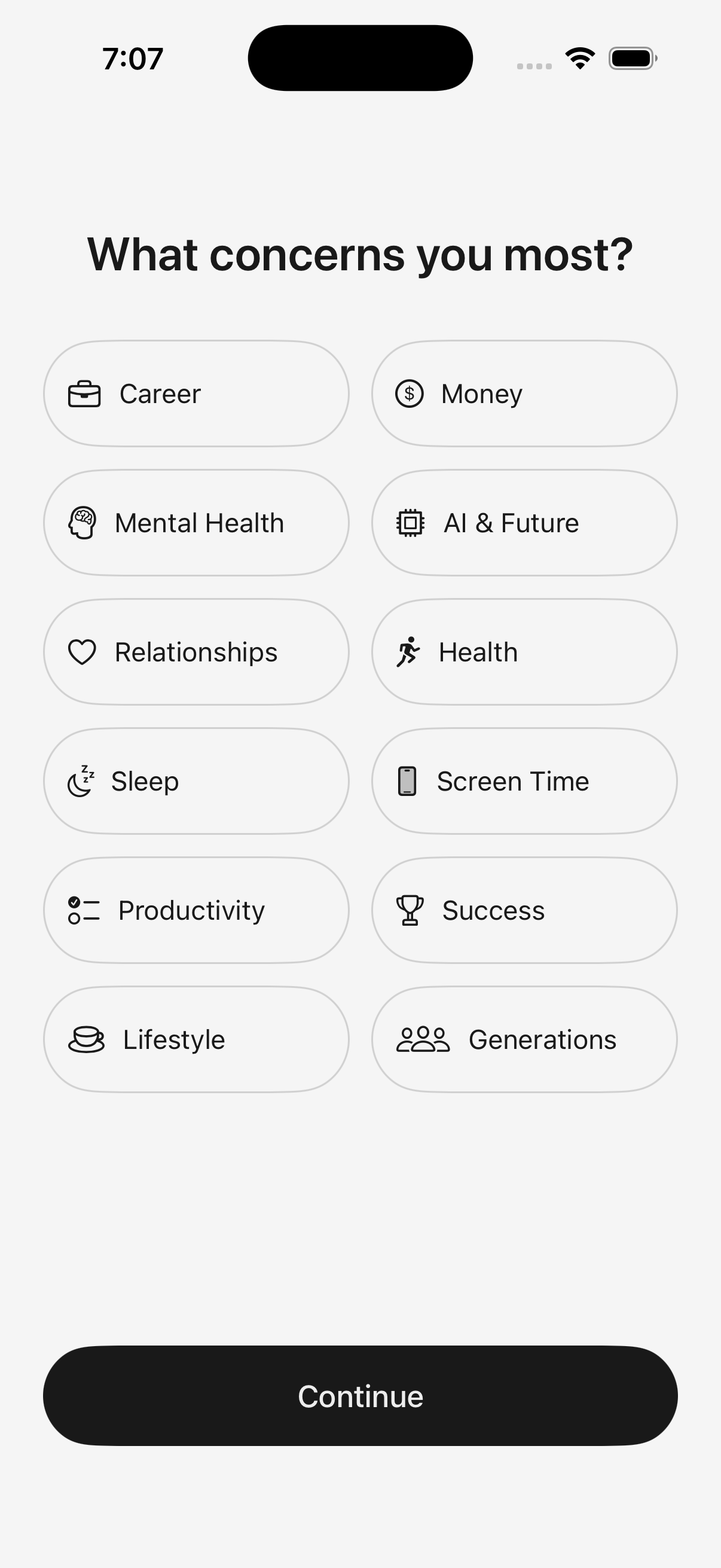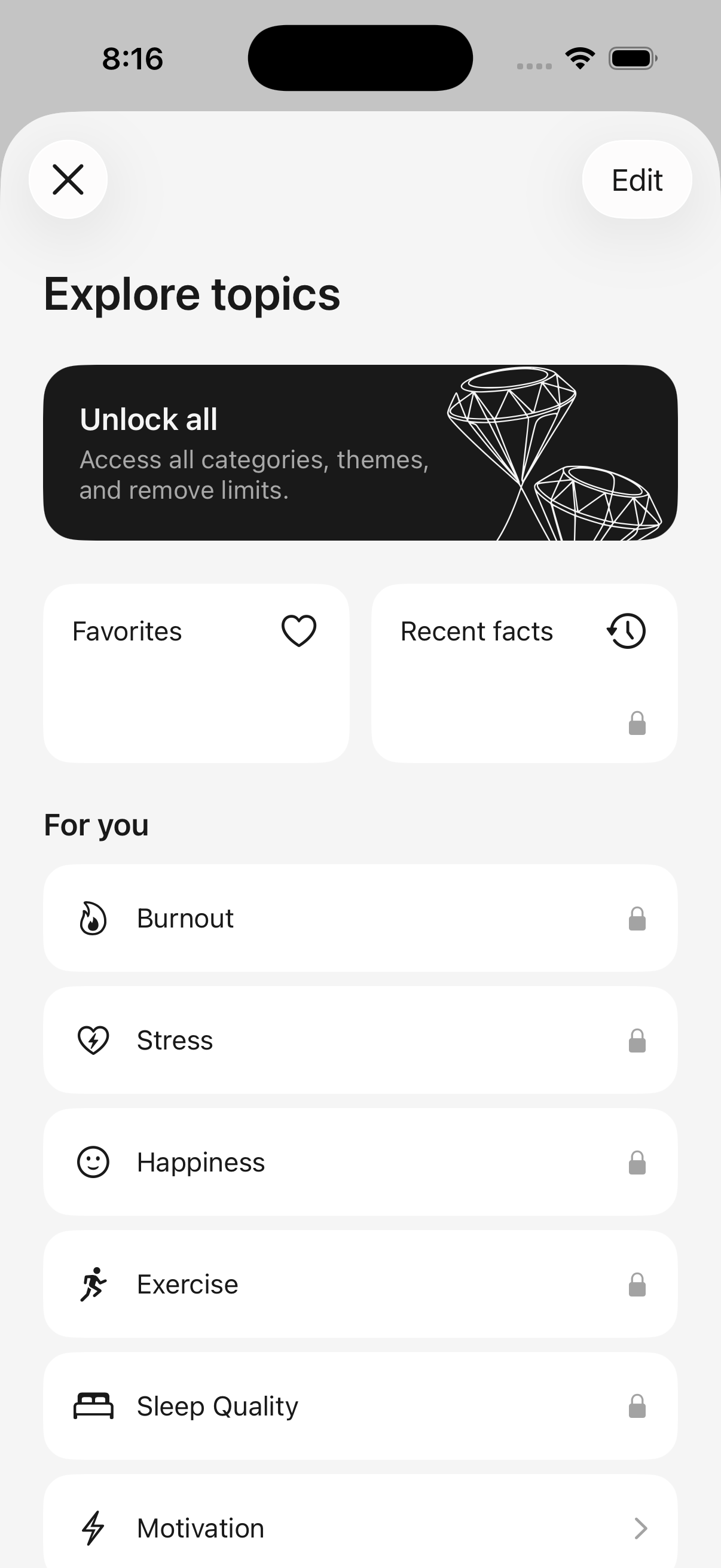 Pick from 12 life categories: Career, Mental Health, Relationships, Sleep, Screen Time, Money, and more. Get facts personalized to what you care about.